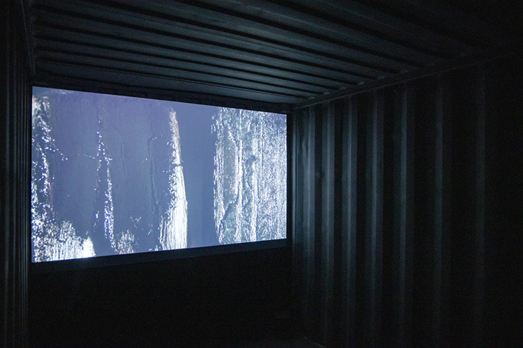 Here, graphs are inscribed by a continuous mechanical airflow into a liquid. The installation presents them in relation to an everyday technology — a portable screen — and an element of collective architecture — a galvanized steel grating ordinarily placed on the floor.