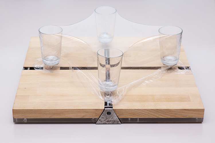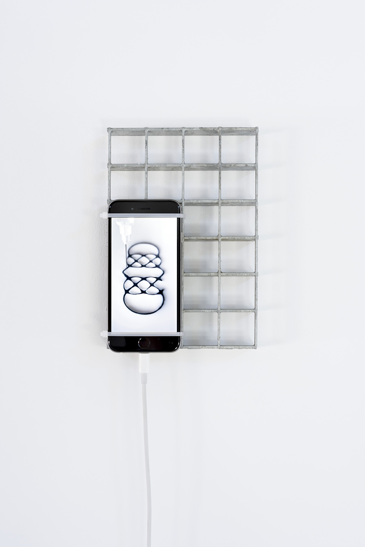 The graphs represent movements, and from there they receive a power of evocation. They can evoke the configuration of a place, a particular technical arrangement, power relationships, the articulation of the terms of a story... Depending on the cultural context, they can evoke very different things, in the same way as a spelling has different meanings in different languages. This proposal is part of a series. In this series the graphs are placed in relation to an everyday technology, an iPhone, and an element of collective architecture, a grating, a galvanised steel grid ordinarily used as a floor. The works thus act as intermediaries between the world of abstract models and that of the experience of an architectural element associated with a technology that has become so ordinary that its use takes place in the unthinking of everyday life. Something takes shape, and it's an almost magical breath that draws it.
