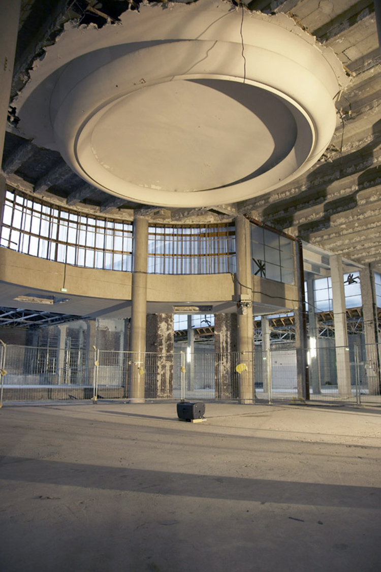 The installation consists of a glass panel, whose dimensions could be those of a shop window. It rests against a structure that conceals the entrance to the space and vibrates at a low frequency (22 Hertz). The vibrations, nearly inaudible, are particularly visible on the edges, where they produce a wave-like phenomenon, and, in a different way, across the entire surface of the glass, which reflects a blurred image of bodies and the architecture.