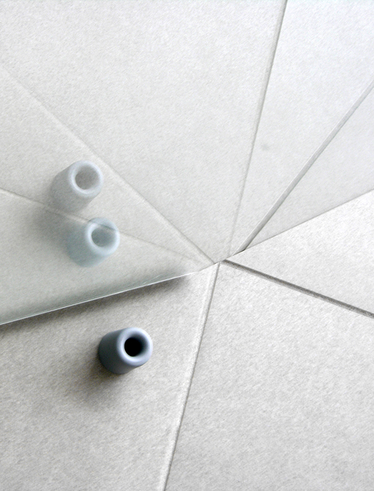 Trois plateaux métalliques accueillent en nombres variables (2,4,6), les parties résultant de la division d’une plaque de verre de format standard: 10x15cm. Chaque plateau repose sur un bloc de mousse synthétique et vibre imperceptiblement selon une fréquence déterminée.